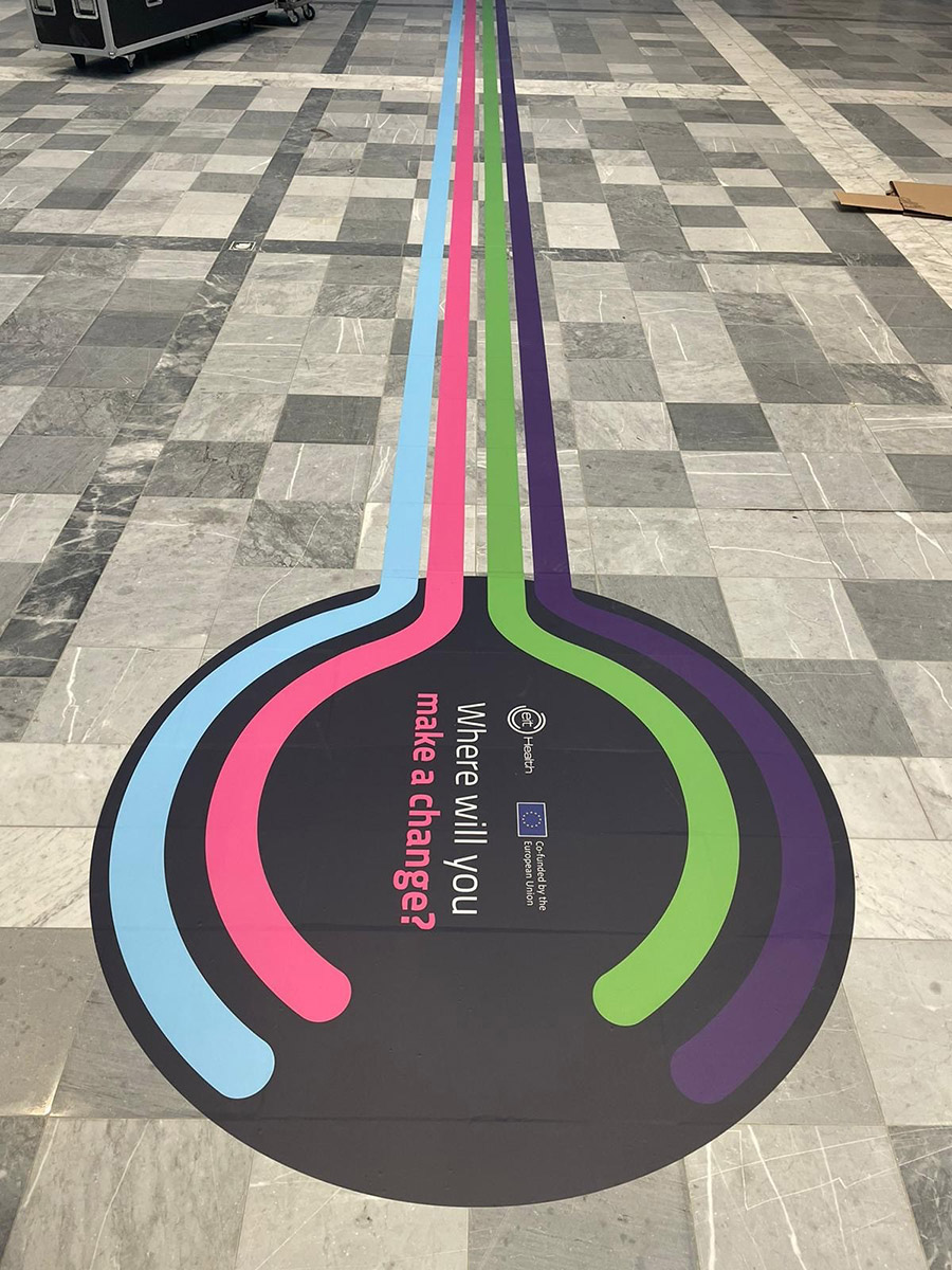 Surprises attendees with creative messaging in unexpected spaces, increasing brand recall.
