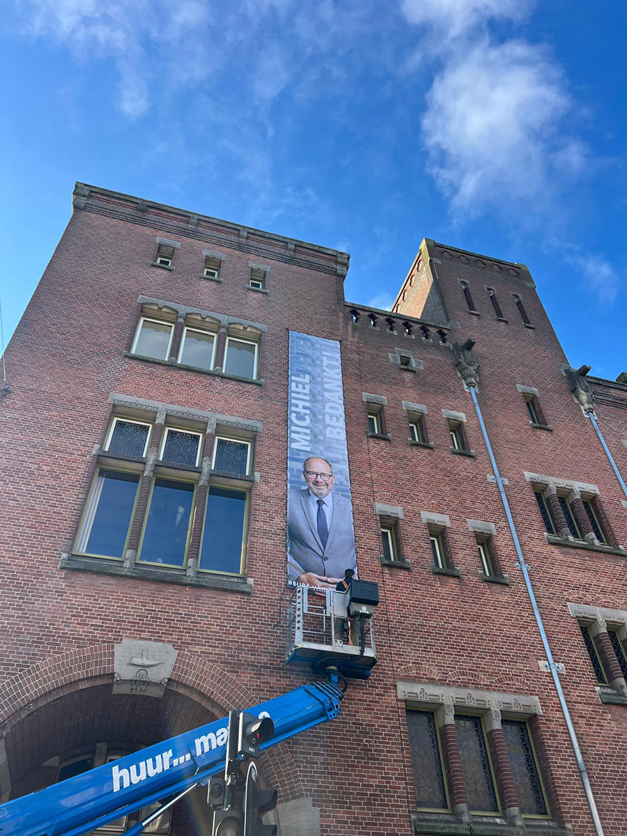 Large outdoor banner that transforms the venue facade into a high-impact branding statement, attracting attendees before they even enter —…